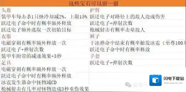 10、以上是各部位绝对不会踩坑的毕业级宝石搭配,这些宝石只要有就可以无脑直接镶嵌上,但是不同流派的玩家都会有自己的打法。因此特意整理了车流派、跃迁电子、极致电磁穿刺以及冰系流派,针对一些特别的怪物,有传送、秒杀、百爆固然重要,但是以下这些宝石也可以留一留,有时候会打出意想不到的效果!