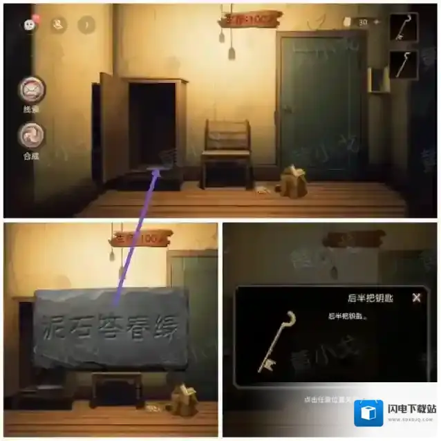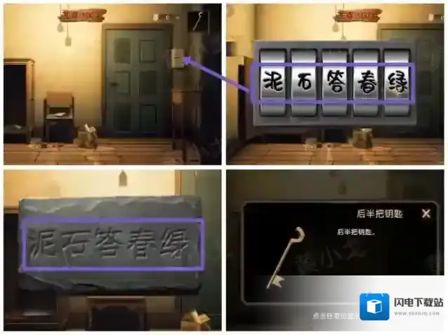 5.点击大门右侧墙上的盒子,根据女主那边的线索,输入密码:泥石答春绿;打开盒子,获得后半把钥匙