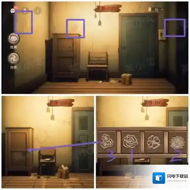 3.点击左侧立柜上的密码锁,根据按钮上花的样式,结合女主那边的线索,按顺序按下按钮