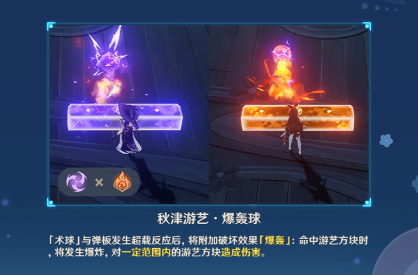 4、推荐角色:火元素+雷元素角色。术球和弹板发生超载反应后,会附加破坏效果[爆轰]。