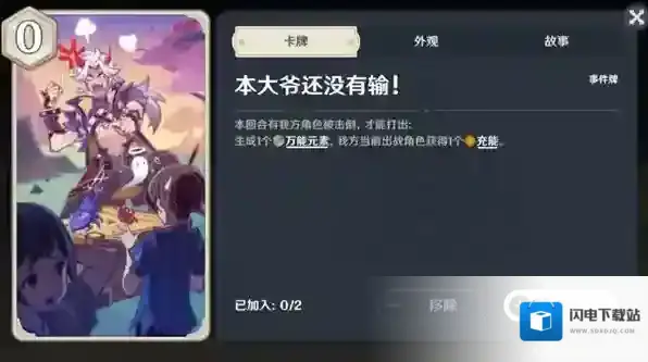 有些人觉得很弱,但考虑到夸张的收益,用了1牌0骰子换来了1个万能元素和1个充能。0骰子啊,1万能骰子啊,1充能啊!要知道,星天之兆这种神牌也都要两个骰子才获得1个充能。个人认为本大爷还没有输!(以下简称本大爷,大家的通用简称应该也是这个)的实际收益在3个同色骰子到4个异色骰子之间。当然了,本大爷的缺点也非常明显,发动的时机非常有限,只有这回合我方有角色阵亡才行。而且我在这里做出一个判断,本大爷在未来PVP中将成为博弈的一个重点,毕竟一张本大爷可以改变的局势太多了,部分人甚至会“送人头”来以求本大爷,而高手也多半也不会收你的头,从而变成一种奇怪的?博弈。本大爷的翻盘能力真的太强了,我觉得目前的卡组应该都是可以带上两张的。