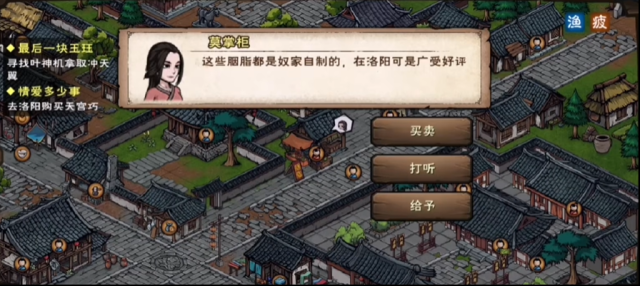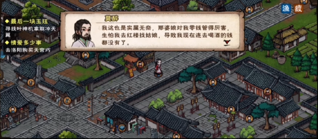 洛阳(18,17):莫醉,交谈,选择此话怎讲,莫醉,交谈,选择天宫巧,选择给予,选择死不承认即可,选择给予获得「天宫巧」×1(帮忙只需12两,原价20两)(如有需要可前往胭脂铺购买第二份,无法使用、丢弃,即永久占据一个格子)
