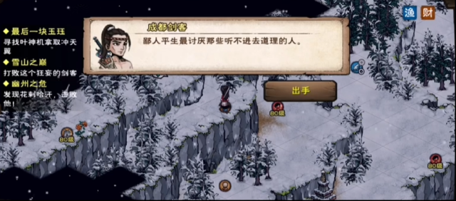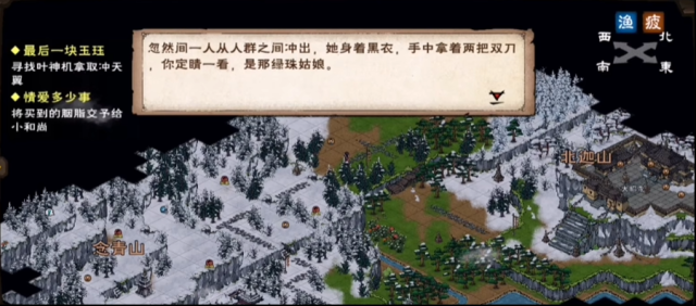 大雪山-念青山(3,25):成都剑客,交谈,成都剑客,出手触发战斗(主角单挑,坚持三回合获胜),胜利后对话绿珠,选择交谈,选择愿闻其详,选择会/不会