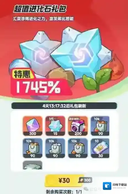 游戏左上角,点击商城就能购买进化石礼包,30r可以买到15个进化石+200普通进化材料,还有一大堆普通物资。要是这杂七杂八的附赠品不算,单看进化石的话也就是2r一颗。