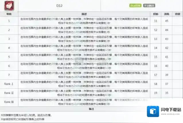 w的2技能更加偏向于处理大波中低甲敌人,这个技能的回转算是很好了,w会优先往有敌人的地方放置地雷,如果攻击范围内没有敌人,则会在攻击范围内随机释放,需要注意的是,地雷实际上是一个干员,是不能在不能部署干员的地方放置地雷的,当然大家如果嫌地雷碍事的话,也可以手动撤离的。因为地雷的放置和爆炸都是不可控,所以这个技能其实上限不高,但是胜在自动释放,非常的省心省力,懒人刀客塔专用,而且在没有敌人的时候也会自动释放,时间长的话甚至可以储存出地雷阵,虽然地雷持续时间有上限,但是不得不说这也是一个很棒的优点,技能专精的优先级在3技能之下。