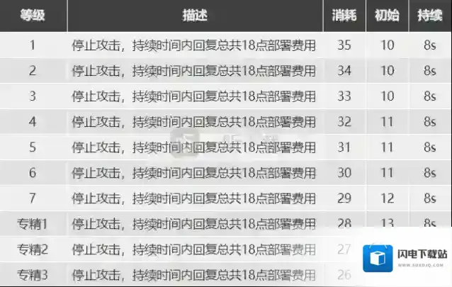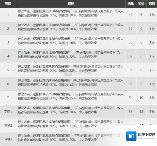 核心技能。极境的二技能通过牺牲回复费用的效率换来了减速、破隐和减防的组合效果,这样的设计使得携带二技能的极境在做好本职任务的同时还可以一定程度上的起到辅助的效果。但是二技能的最大捕捉数为四人,也就是说最多仅能干涉到四名敌人。并且由于二技能回费效果没有一技能突出,携带二技能在前期就不可避免的需要在反隐和回费之间做出选择。此外,由于该技能带来的减防效果是百分比减防,因此基本所有物理输出干员都能够从这个buff中获利。