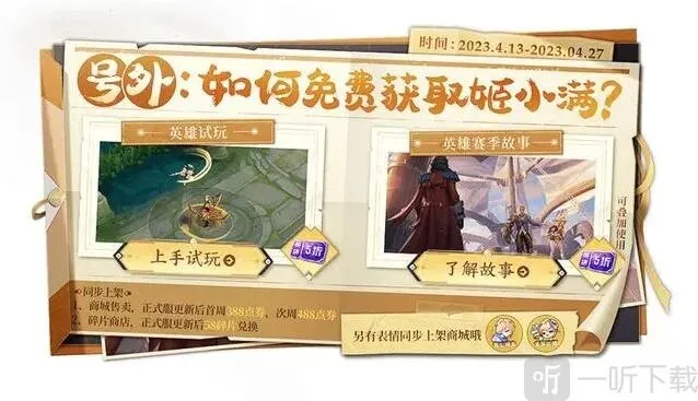 新英雄姬小满将在4月13日上线,定位战士,难度较高,售价13888金币,通过英雄试玩和赛季故事系统可免费获得该英雄。