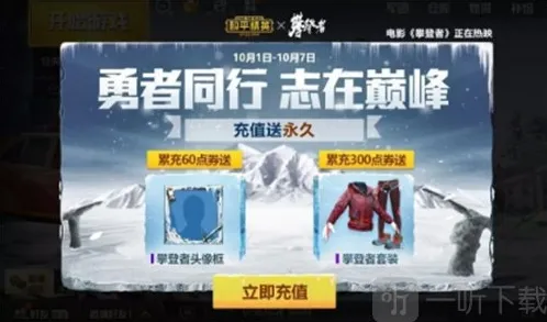 充值送套装:10月1日-10月7日,累计达到60点券,可获得攀登者头像框;达到300点券可获得永久攀登者套装。