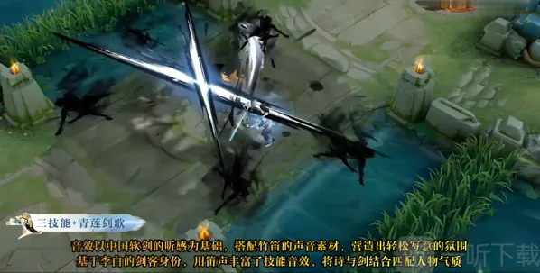 李白的大招音效是以中国的软剑为基础的,搭配率竹笛为辅,技能在释放后会出现四道由墨水组成的人影。