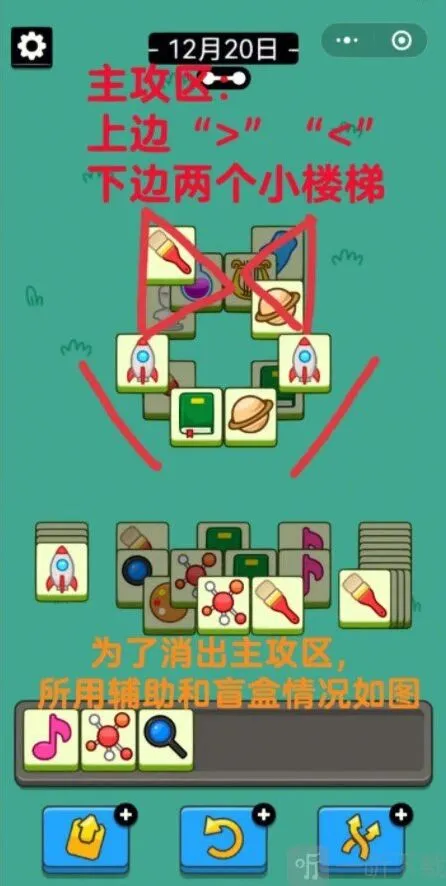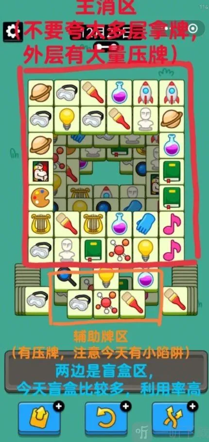 普通场:今天需要注意的是不要搞错主消区和辅助区的牌。如图所示,4个角的牌都是辅助区,前期最好不要用。但今天为了消出主攻区的样子前期可能没有那么顺,需要用到盲盒和辅助区的牌。