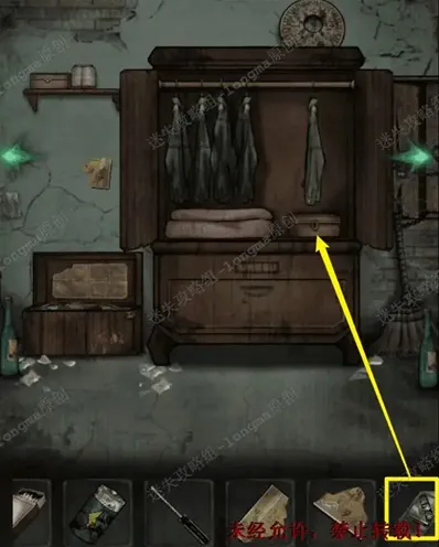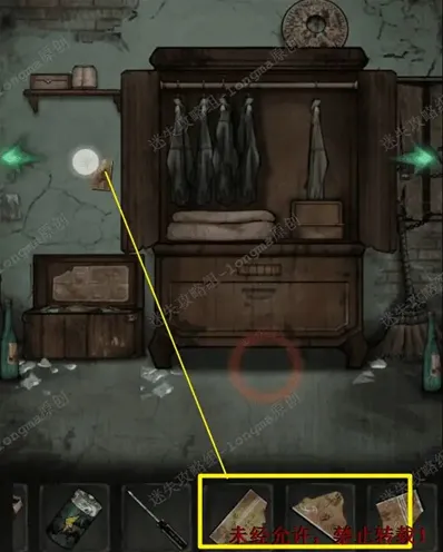 16.向左移动至衣柜处,打开衣柜,点击晃动右边的衣服,衣服中掉出发条,衣柜左边墙上的木板上获得针线。