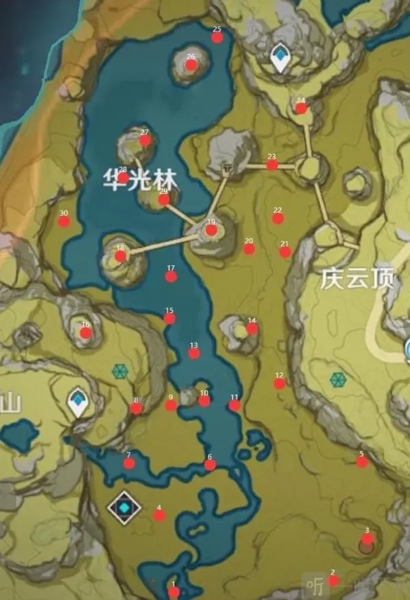 八号:利用左边的传送点直接传送到山上,然后从山上慢慢往下飘。一开始会因为你的高度太高,小地图上不显示这个逐月符的位置,慢慢往下飘就会一口气跳出来一大堆。总之,位置是小地图标注位置的山坡上。(找不到的话带个凝光,让她用被动标注出边上的铁矿石的位置,顺着铁矿石的位置飞就能找到)