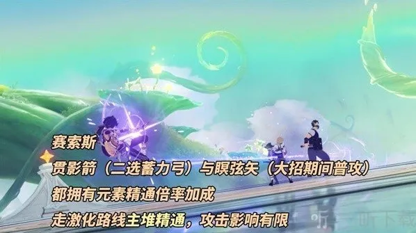 「弹弓」354基础攻击力、31.2%暴击率、60%重击增伤。这基础攻击力差了那么多,真的没关系么?没事的,毕竟赛索斯贯影箭(二选蓄力弓)与瞑弦矢(大招期间普攻)都拥有元素精通倍率加成,外加激化玩法,最终培养将会主堆精通,受攻击影响较小。结论二,若搭配纳西妲,赛索斯精通已经非常高,也可忽略此武器用弹弓。