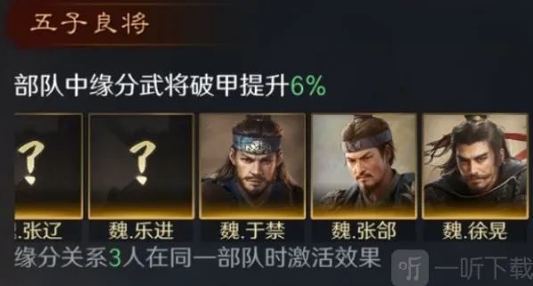 这个阵容能够激活缘分“五子良将”,部队里武将的“破甲”提升,伤害更高。于禁、张郃都能够对敌人施加“缴械”状态,从而有效限制其输出能力,而徐晃够给敌军施加“技穷”状态,使其在战斗中无法发动主动战法,更进一步削弱敌军整体战斗能力。三名武将施加的控制状态能够有效限制敌军的输出,使己方战损降低到最低。
