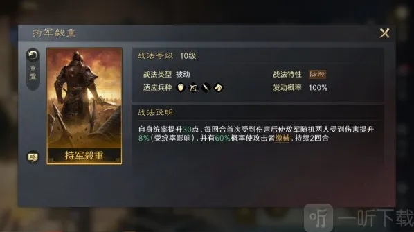 持军毅重,被动战法,提升自身统率值,“缴械”状态针对的目标是敌方第一位对于禁造成伤害的武将。
