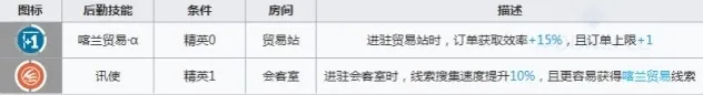 讯使的基建技能用处还过得去,贸易站加成是真的没用,幅度实在太低,这大概就是传说中的喀兰(丢人)贸易了吧。但是第二基建技能提高了喀兰贸易的线索获取几率,也就是线索6了,可以在会客室上班的。