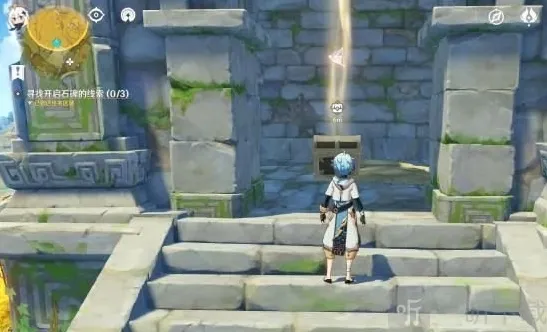 接取任务后,需要寻找 3 个线索破解机关,其实很容易,地图上面会有 1 个很明显的光柱,往高处爬一下就很容易就看到了!