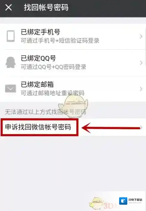 2、在找回密码页面点击页面中间位置,就当自己无法通过微信给提供的几种方式找回帐号密码,选择申述找回微信帐号密码。
