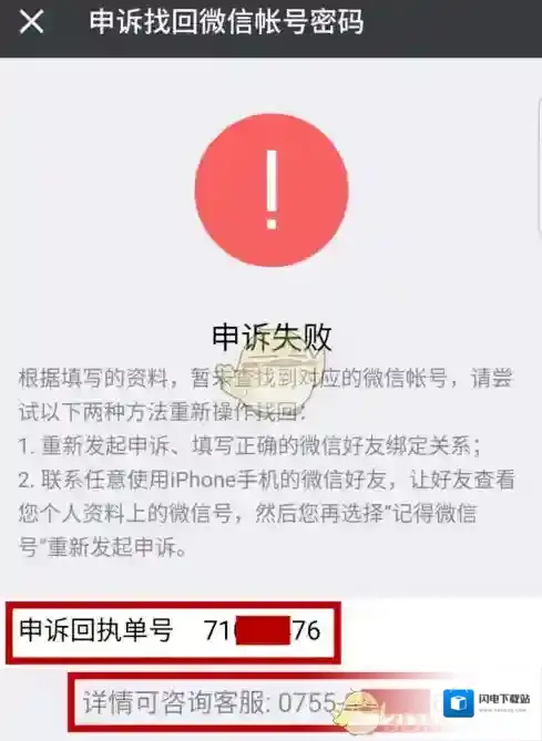 7、最重要的步骤出来了,申诉结果会提示失败,页面里面有一个申诉回执单号,取笔和纸记住回执编号,并电话拨打申回执单号下方的客服热线。