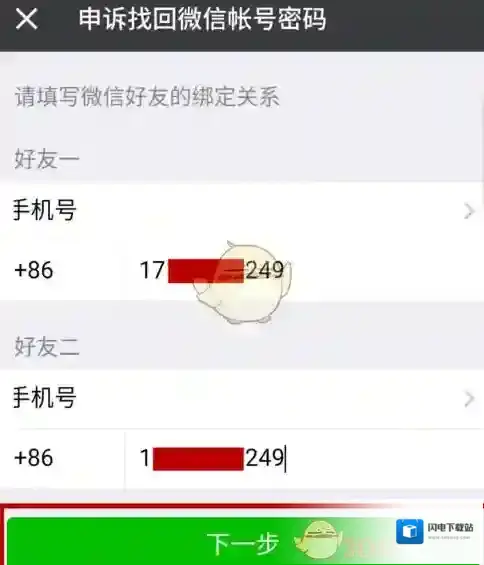 6、在填写微信好友绑定绑定关系页面,由于我们这个申诉的微信没有添加任何好友,所以小编填写的是注册手机号码,是的,自己的号码写了两遍,你也可以随便写,这个不重要。填完点击下一步。