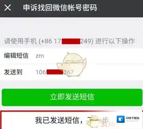 5、按照提示,发送短信验证码。发送完毕后点击我已发送短信,下一步。