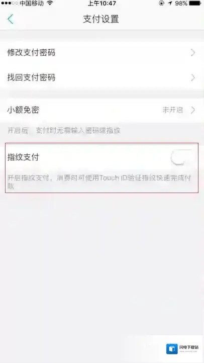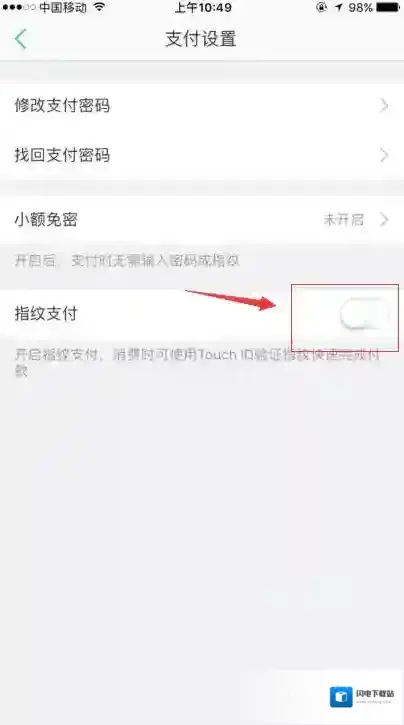 第四步,在支付设置页面中,可以看到“指纹支付”页面中是处于关闭状态的,也就是说此时是用不了指纹的点击的,点击打开。如图所示: