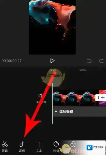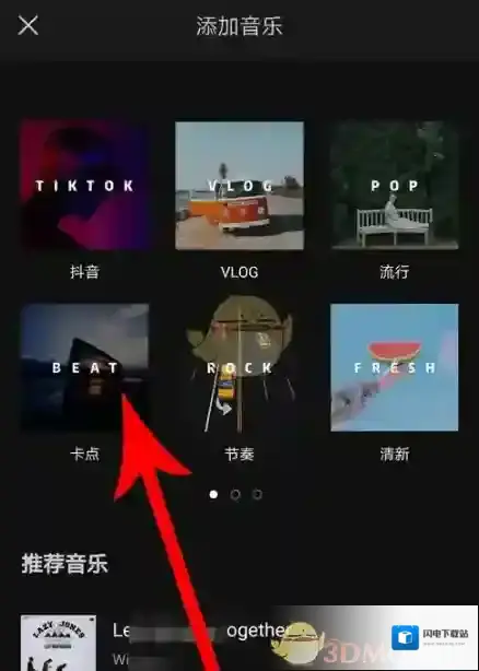 2、而在进入编辑界面之后,我们就可以找到底端的“音频”功能,并且从下方列表里选择“音乐”按钮,找到在线卡点的曲库。