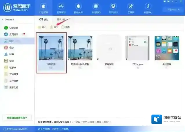 在照片管理主界面中,找到并选中需要备份的相簿,点操作栏中的导出按钮,将照片导出到电脑中,确保导出成功后,删除该相簿内的部分或者全部照片即可释放设备存储空间