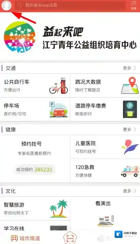2、打开我的南京APP后,在首页点击左上角的头像,进入账号注册页面。