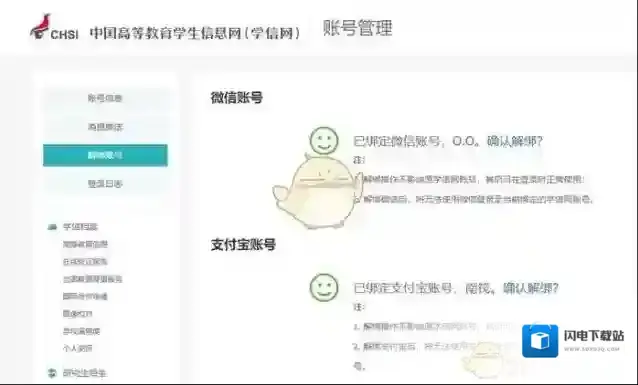 8、点击绑定按钮之后,进入账户信息,在左侧选择解绑账户查看当前账户下绑定的账户,如果没有绑定的微信、支付宝账户,可以重新按照上方步骤进行绑定。