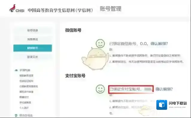 6、点击绑定按钮之后,进入账户信息,在左侧选择解绑账户查看当前账户下绑定的账户,如果没有绑定的支付宝账户,可以重新按照上方步骤进行绑定,绑定之后,下次登录时可以直接使用支付宝登录。
