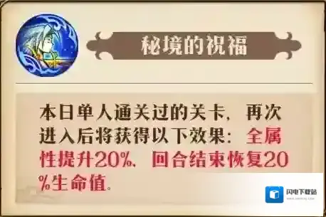 当玩家以单人形式完成「兄贵训练场」、「女神的试炼」之后,会获得「秘境祝福」增益效果。