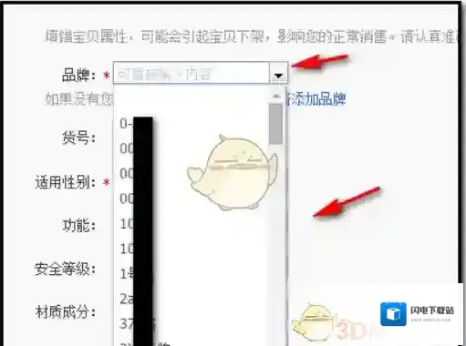 4、先填写宝贝的品牌,选择店铺的品牌,如果品牌名称不在这里的话,直接在输入框内输入宝贝品牌名称,也可以填写“other/其他”来代替品牌名称。