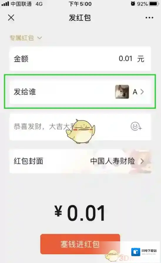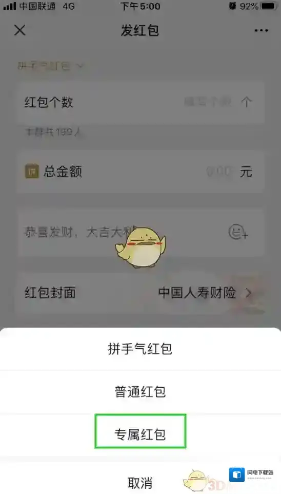 5、发送红包之后,该红包只有你指定的人可以领取,红包上也会出现“给XXX的专属红包”字样。