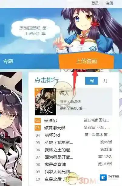 1、想将作品上传到动漫之家的话,用户需要搜索进入到动漫之家的官网,注册登录账号并选择主页右侧的“上传漫画”功能。