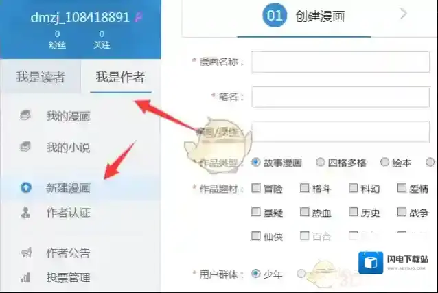 2、随后页面会跳转到个人中心,选择“我是作者”功能找到“新建漫画”的选项,在右侧填写自己投稿的漫画相关信息。
