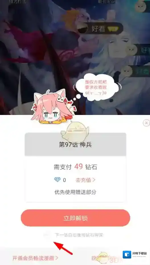 《看漫画》取消自动购买方法 2025-07-14 07:25:13 编辑: 小鱼儿 分类: 应用教程 • 阅读: 902 2、打开漫画的付费章节之后,从订阅窗口的下方我们可以找到“下一话自动使用钻石购买”的选项,而在点击取消这项设置之后,软件就不会自动为你购买下一章了! 本文内容来源于互联网,如有侵权请联系删除。 看漫画应用相关内容 全部 看漫画 看漫画我们可以 看漫画自动 看漫画下一话 看漫画打开漫画 看漫画钻石购买 《看漫画》退出账号方法 1、首先打开看漫画APP,选择右下角的“我的”选项。 2、在个人页面内点击“软件设置”功能。 3、点击设置页面下方的“退出登录”即可。 本文内容来源于互联网,如有侵权请联系删除。 2025-07-30 《看漫画》弹幕关闭方法 1、打开看漫画app后,在我的界面点击“软件设置”功能。 2、当我们进入到软件设置的页面之后,从列表中选择“阅读设置”功能。 3、在阅读设置页面的上方,用户就能够直接管理弹幕与弹幕头像的开启或关闭了。 本文内容来源于互联网,如有侵权请联系删除。 2025-07-14 发表回复 请登录后评论... 登录后才能评论 评论列表 ( 0条)