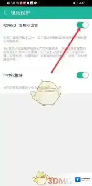 《360影视大全》程序化广告关闭方法 2025-07-20 19:25:26 编辑: 萌萌哒 分类: 应用教程 • 阅读: 472 1、首先打开360影视大全,点击我的。 2、然后点击设置。 3、接着点击隐私设置。 4、随后点击隐私保护。 5、之后把程序化广告展示设置的按钮关闭即可。 本文内容来源于互联网,如有侵权请联系删除。 360影视大全应用相关内容 全部 360影视大全点击 360影视大全隐私设置 360影视大全关闭 360影视大全程序化广告 360影视大全 360影视大全影视大全 《360影视大全》视频头条开启方法 1、打开360影视大全首页,点击我的。 2、然后进入我的页面之后,点击设置。 3、接着点击视频头条。 4、最后将视频头条的开关开启,设置完成。 本文内容来源于互联网,如有侵权请联系删除。 2025-07-20 发表回复 请登录后评论... 登录后才能评论 评论列表 ( 0条)
