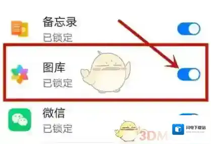 4、在应用列表中找到“图库”,将应用锁设置为“开启”状态。