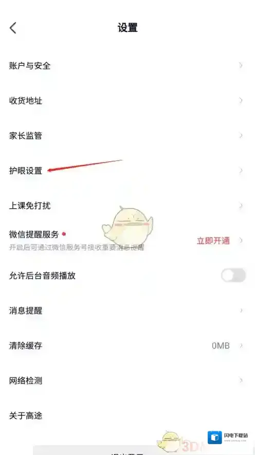 《高途课堂》观看时长提醒关闭方法 2025-07-28 07:22:37 编辑: 小烜 分类: 应用教程 • 阅读: 392 1、打开高途课堂后,点击右下角我的; 2、然后在我的页面点击右上角的设置选项; 3、接着在设置页面,点击护眼设置选项; 4、最后在护眼设置页面,将“观看时长提醒”后的开关关闭。 本文内容来源于互联网,如有侵权请联系删除。 发表回复 请登录后评论... 登录后才能评论 评论列表 ( 0条)