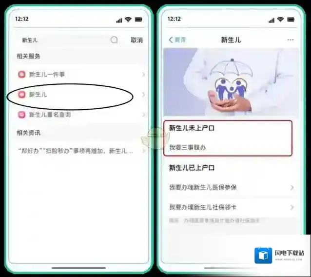 4、如果是新生儿:搜索“新生儿”,点击“我要三事联办”,可“新生儿上户口、城乡居民参保登记、社会保障卡”三件事同时办理。
