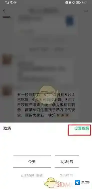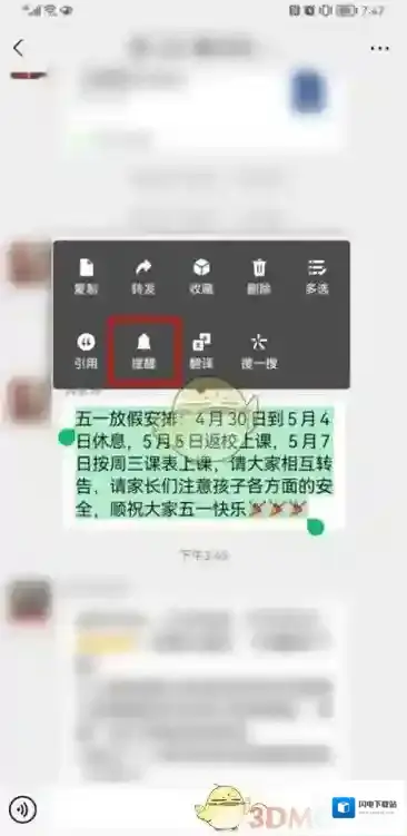 《微信》聊天消息提醒设置方法 2025-07-28 20:38:54 编辑: 青梅煮酒 分类: 应用教程 • 阅读: 873 2、点击设置提醒之后,选择好下方提醒的时间就可以了,这样到了时间就会自动提醒了。 本文内容来源于互联网,如有侵权请联系删除。 微信官方最新版 更新时间: 2025-07-22 应用分类: 其它应用 应用平台: Android 应用评分: 4分 安卓版下载 应用厂商信息 应用厂商: 腾讯 应用备案: 粤B2-20090059-1621A 权限说明: 点击查看 隐私政策: 点击查看 应用相关版本 微信官方最新版 更新时间: 2025-07-22 查看详情 微信新功能介绍 目前,微信通讯录已经支持一次性删除已经删除或屏蔽你的好友。 当微信通讯录达到10000人的上限后,系统会提示无法继续添加好友,并跳转到已把你删除的联系人列表之前,用户一次只能删除5个单方面删除自己的好友,之后才能继续添加新好友。 最新... 发表回复 请登录后评论... 登录后才能评论 评论列表 ( 0条)
