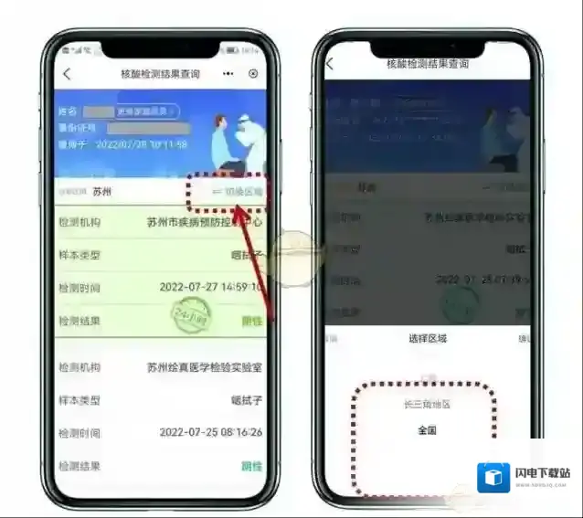 2、按需选择“苏州”、“上海”、“长三角地区”或“全国”,不管您在国内哪个城市做的核酸检测,一键速查核酸检测结果。