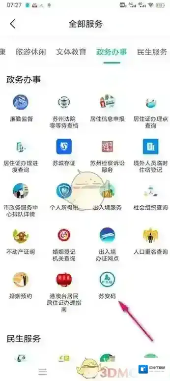 2、点开政务办事选项卡,点击最后一个苏安码。