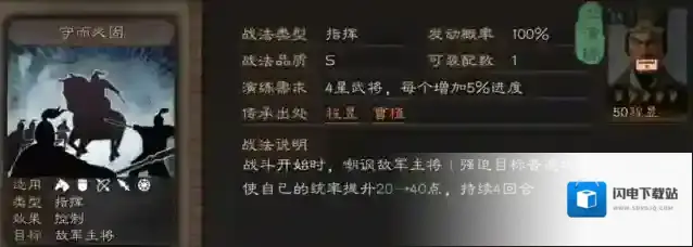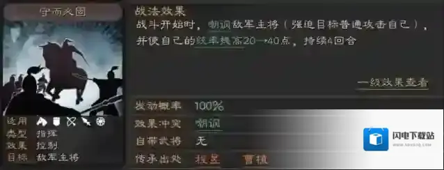 从图中可以看到战法升级效果一样,升级只会提升更多统率属性加成。战法的重要效果是嘲讽主将,升级的收益并不高。要注意的是和其他嘲讽类的战法会有冲突,所以配备的时候要注意不能重叠。