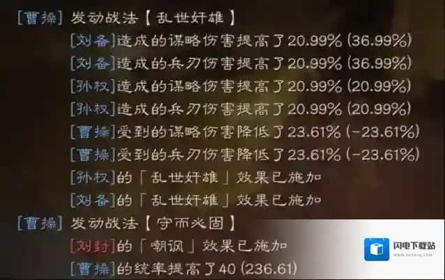 曹操的自带战法乱世奸雄可以为友军增加伤害,同时降低自身受到的伤害。配备守而必固后可以更好的保护友军,让友军保持兵力与良好的输出。