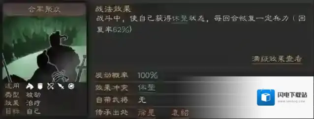 合军聚众是由徐晃、袁绍传承而来,可以使自身获得休整状态,每回合恢复兵力。和守而必固搭配可以增强武将自身的续航能力,避免吸收普通攻击过多而自取灭亡。