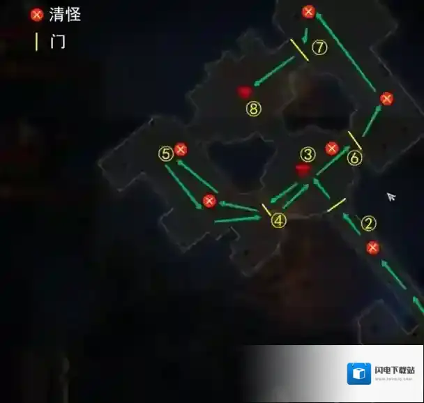 ① 清小怪,门自动打开 → ②清掉小怪,门自动打开 → ③击杀小BOSS血红女祭司殷娜洛丝,对话 → ④开门 → ⑤沿路线清怪 → ⑥清怪后门自动打开 → ⑦清怪,门自动打开 → ⑧击杀大BOSS女伯爵,结束副本