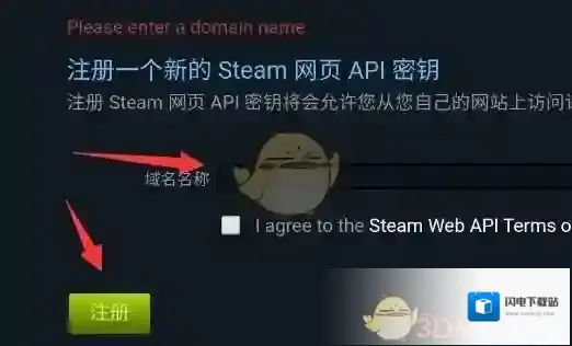 6、在其中输入域名名称,勾选下方协议,再点击“注册”就可以获取apikey了。