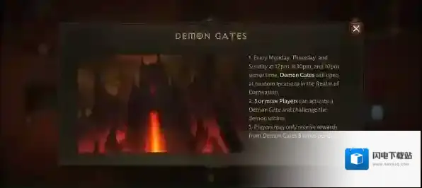 玩法:需组满3-4人才可以参加,开放时间会在地图上随机出现恶魔之门,打完可获奖励